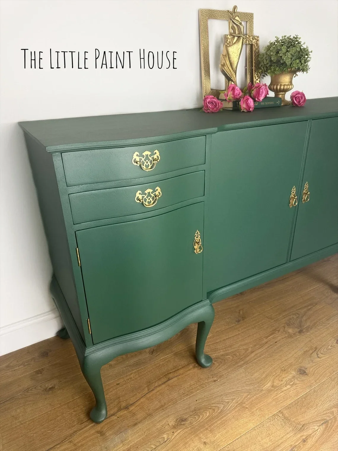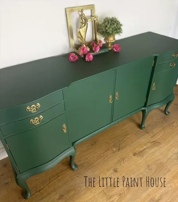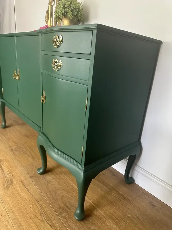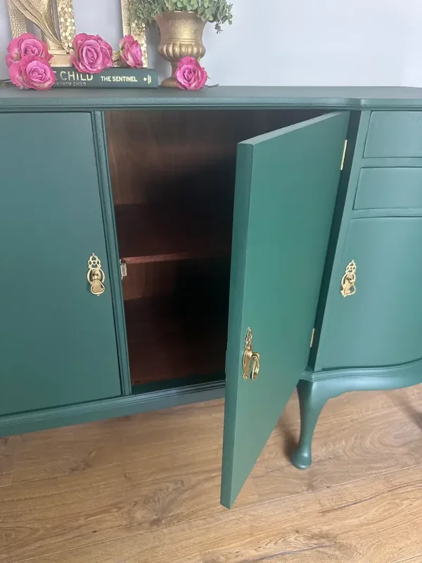 This stunning, rare and unique Green sideboard will certainly bring the wow factor to any room. A Sturdy well made solid and sturdy piece of furniture Comprises of 4 drawers with 2 of them being lined cutlery compartments ( these can be removed ) 4 cupboards with 2 shelves.