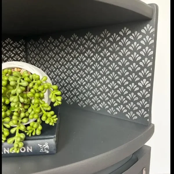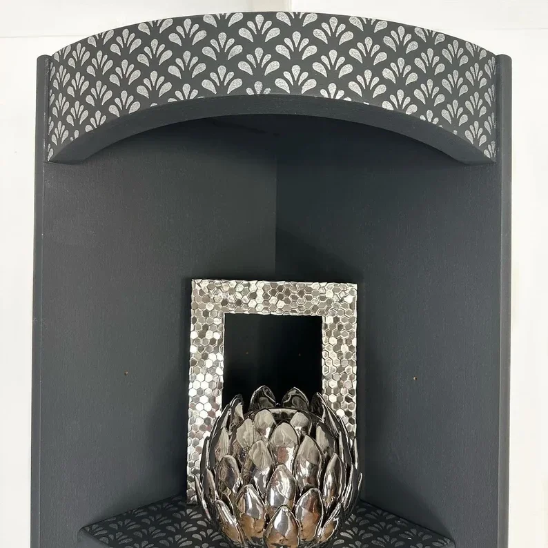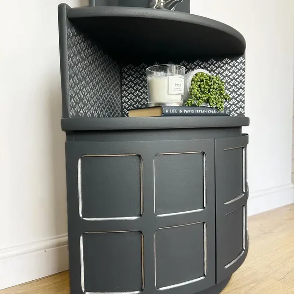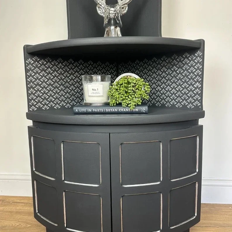 Add some glamour to any corner of any room with this quirky cabinet. This piece really is so unique it will make you happy every time you look at it. Funky yet functional. This cabinet has been made from solid teak wood. The main colour is Dark Grey Ash by Fusion. Hand Stencilled Silver Pigments onto some parts for that wow factor. Silver pigments have been hand painted onto parts of the cabinet doors to give it that unique look. The inside cupboard has been left unpainted but treated with furniture balm.