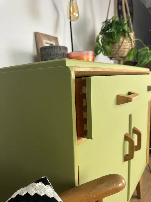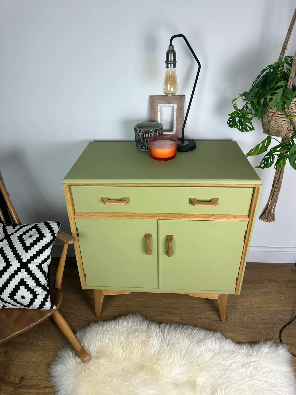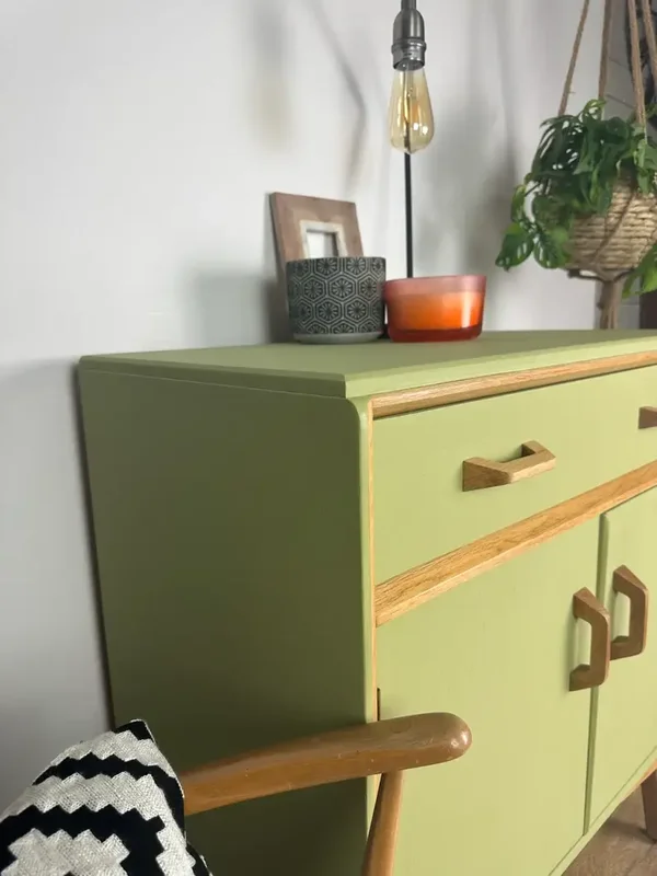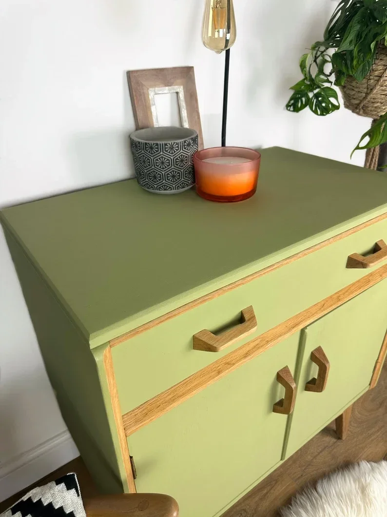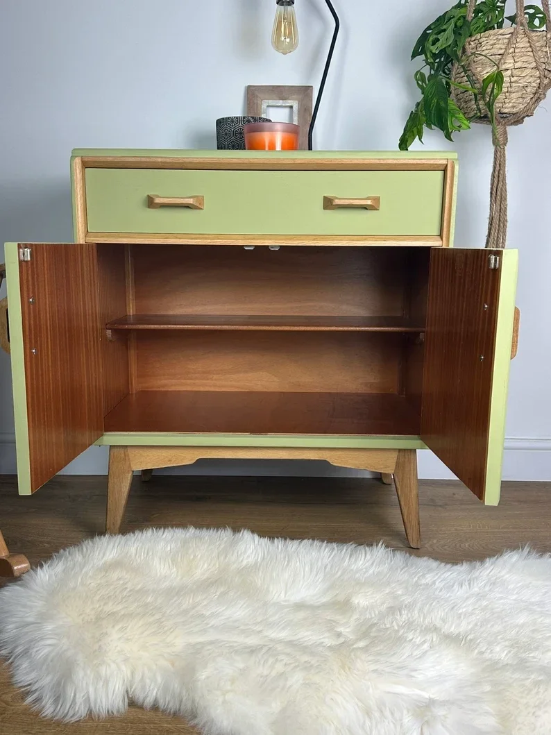 Gorgeous G Plan Mid Century Sideboard has been brought up to date with this yummy Lime Green Paint. Some of the teak has been left exposed and has been treated with osmo oil. Such a cute little head turner in any room. Two Drawers and a cupboard with shelving space. This could even be used as a drinks cabinet. The photos really don’t do this piece justice. It makes me happy 😃 every time I look at it.